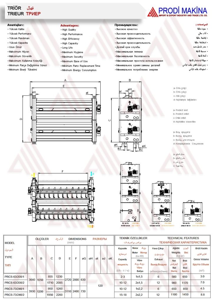 It is used in flour, semolina, and bulgur factories, grain storage facilities, pulse processing plants, and other industrial facilities. It serves to separate broken and foreign materials in agricultural products such as grains and seeds based on their size or shape. It is commonly used for cleaning and classifying wheat, barley, corn, sunflower seeds, and similar grains. The trieur is an essential piece of equipment for ensuring quality control in agricultural products and facilitating their processing.